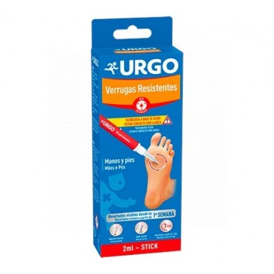 Antes de su uso, lea atentamente el modo de empleo. El stick de URGO VERRUGAS RESISTENTES contiene un gel altamente eficaz pero corrosivo. Para uso externo únicamente en manos y pies. Si no está seguro de que su afección cutánea sea una verruga, consulte a un médico antes de usar este producto.