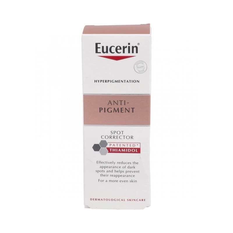Eucerin Anti-Pigment Corrector de manchas es un gel no graso con un aplicador de uso tópico que facilita la aplicación precisa en áreas pequeñas con hiperpigmentación. Contiene Thiamidol, un principio activo eficaz y patentado que actúa en el origen de la hiperpigmentación reduciendo la producción de melanina. Se ha demostrado clínica y dermatológicamente que, aplicado directamente en las manchas oscuras, las reduce y evita su reaparición. Los primeros resultados son visibles después de dos semanas y mejoran continuamente con el uso regular. La piel se ve más uniforme.