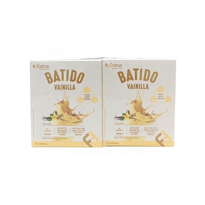 Batido de vainilla farline es un complemento alimenticio a base de proteínas lácteas enriquecido con vitaminas y minerales.