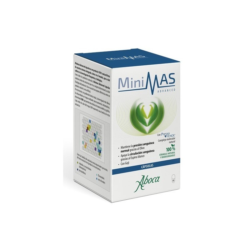 Minimas Advanced MANTIENE LA PRESIÓN SANGUÍNEA NORMAL GRACIAS AL OLIVO. APOYA LA CIRCULACIÓN SANGUÍNEA GRACIAS AL ESPINO BLANCO. CON GOJI. Minimas Advanced es un producto 100 % natural que nace de las avanzadas plataformas científicas de la investigación de Aboca, que han permitido desarrollar el innovador complejo molecular PressoFenol compuesto por fenoles, como procianidinas y flavonoides de Olivo, Espino blanco y Goji.