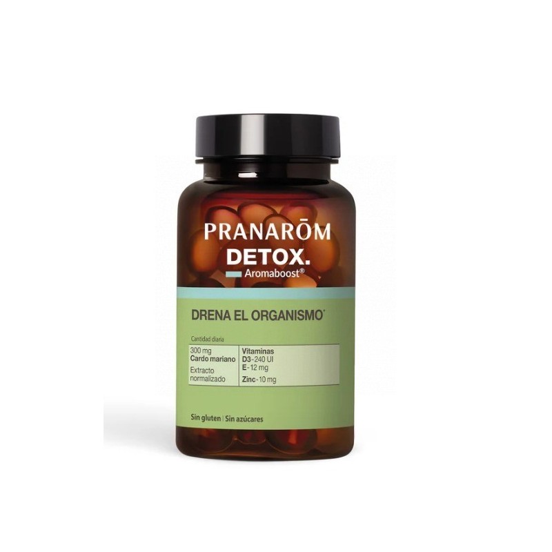 Aromaboost DETOX es un complemento alimenticio diseñado para ayudar a drenar el organismo y favorecer la eliminación de toxinas. Este suplemento, sin riesgo de adicción, promueve el buen drenaje de los órganos de eliminación con una cura recomendada de 1 mes. Las cápsulas Aromaboost DETOX están formuladas con extracto seco estandarizado de cardo mariano, zinc, y vitaminas D3 y E. La fórmula se potencia con una sinergia experta de esencia de limonero y aceites esenciales de enebro y cardamomo, garantizando un 92.8% de ingredientes de origen natural, sin azúcar y sin gluten.
