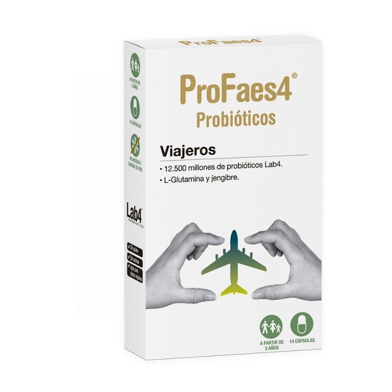 ProFaes4® Viajeros, combinación única de probióticos Lab4, glutamina, jengibre. Ingredientes especialmente seleccionados para ayudar a cuidar y mantener la microbiota intestinal en buen estado