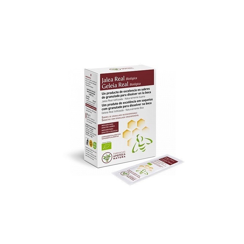 Del mundo de los productos de la colmena a los sobres de granulado bucodispersable monodosis, la Jalea Real Biológica aúna la practicidad de la administración en cualquier momento del día y todos los beneficios y la calidad del alimento exclusivo de la abeja reina. Adecuada para todas las edades y especialmente para los niños, la Jalea Real Biológica se disuelve instantáneamente en la boca y, en las dosis recomendadas, es capaz de garantizar un aporte diario equivalente a 500 mg de Jalea Real fresca.