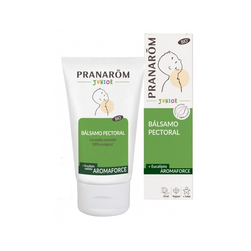 El Bálsamo pectoral Aromaforce Junior contiene aceites esenciales 100% ecológicos de eucalipto radiata, mejorana, tomillo quimiotipo tuyanol, ravintsara, menta de campo, abeto balsámico y olivardilla, con un olor refrescante y purificante. Alivia y aporta una sensación de bienestar al niño cuando aparecen molestias causadas por el frío. Su textura, que se funde en la mano, permite una aplicación fácil.