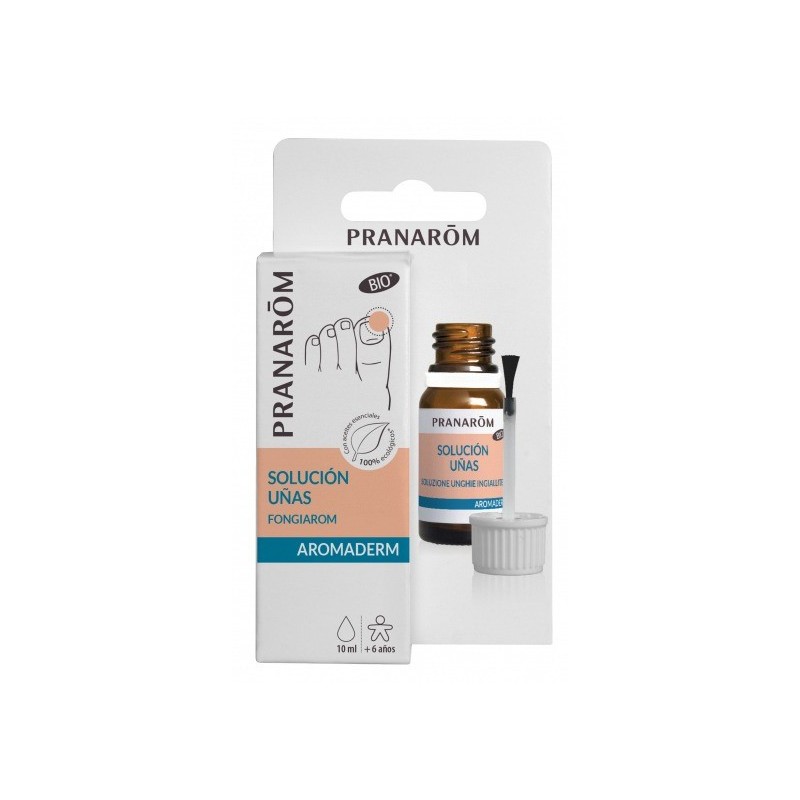 AROMADERM Solución Uñas FONGIAROM permite tratar localmente la uña. Gracias a los aceites esenciales de palmarosa, lemongrass, niaulí, lavandín, citronela de Madagascar y clavo, y a los aceites vegetales de hipérico y oliva, la uña se regenera de forma natural y recupera un aspecto sano. Práctico gracias a su pincel aplicador.